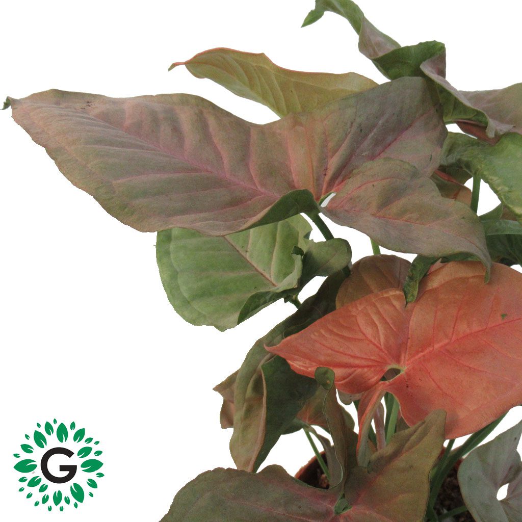 Syngonium podophyllum “Pink” has bright glowing pink arrowhead shaped foliage.